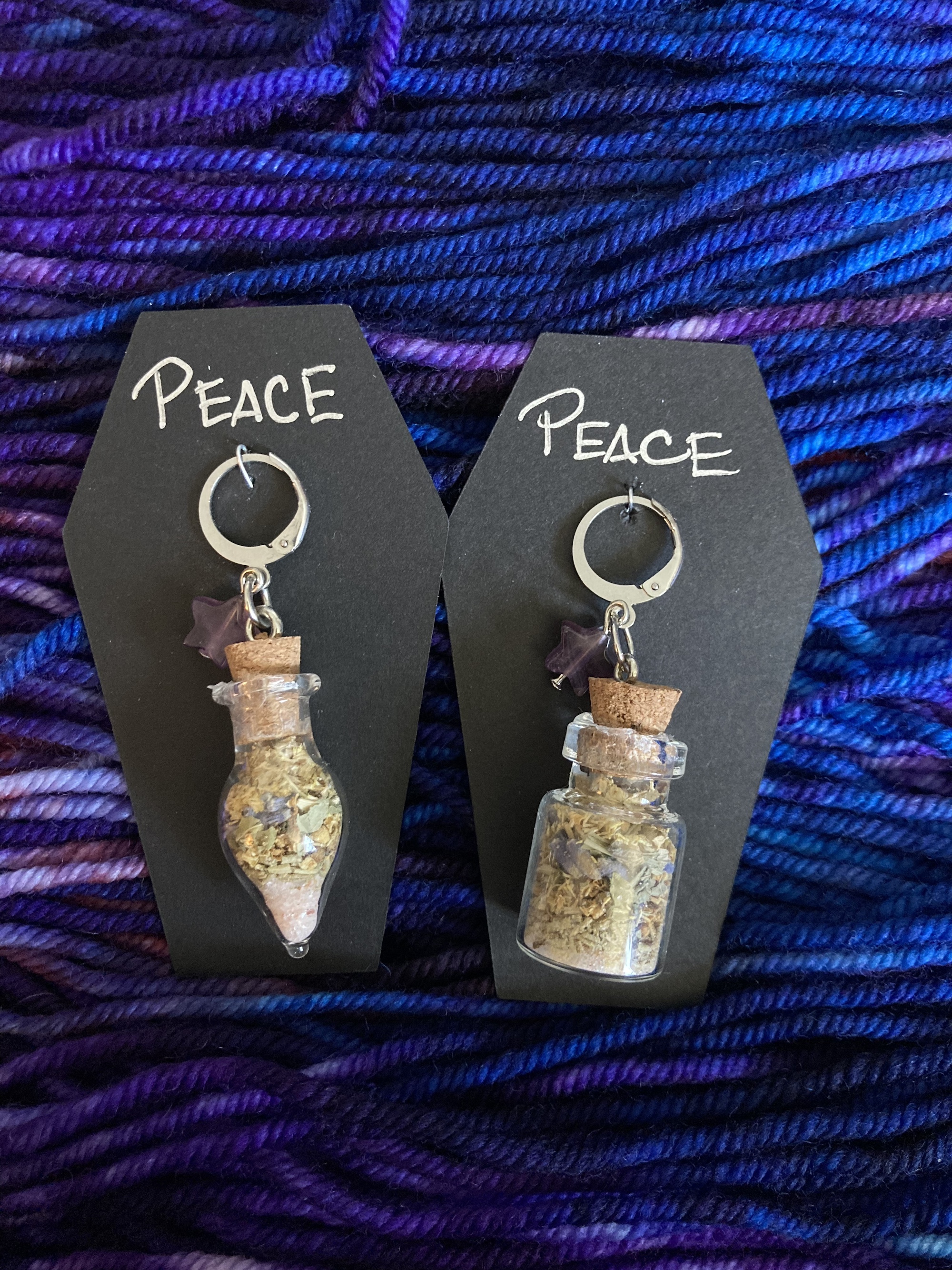 They are about 2" long and the corks are glued into place to keep them securely shut. The jars hang from a lever back earring hook for ultimate versatility. There are two jar shapes to choose from, teardrop and bottle shaped. The jars are glass so they are best for gentle use! Stitch markers are sold individually.
