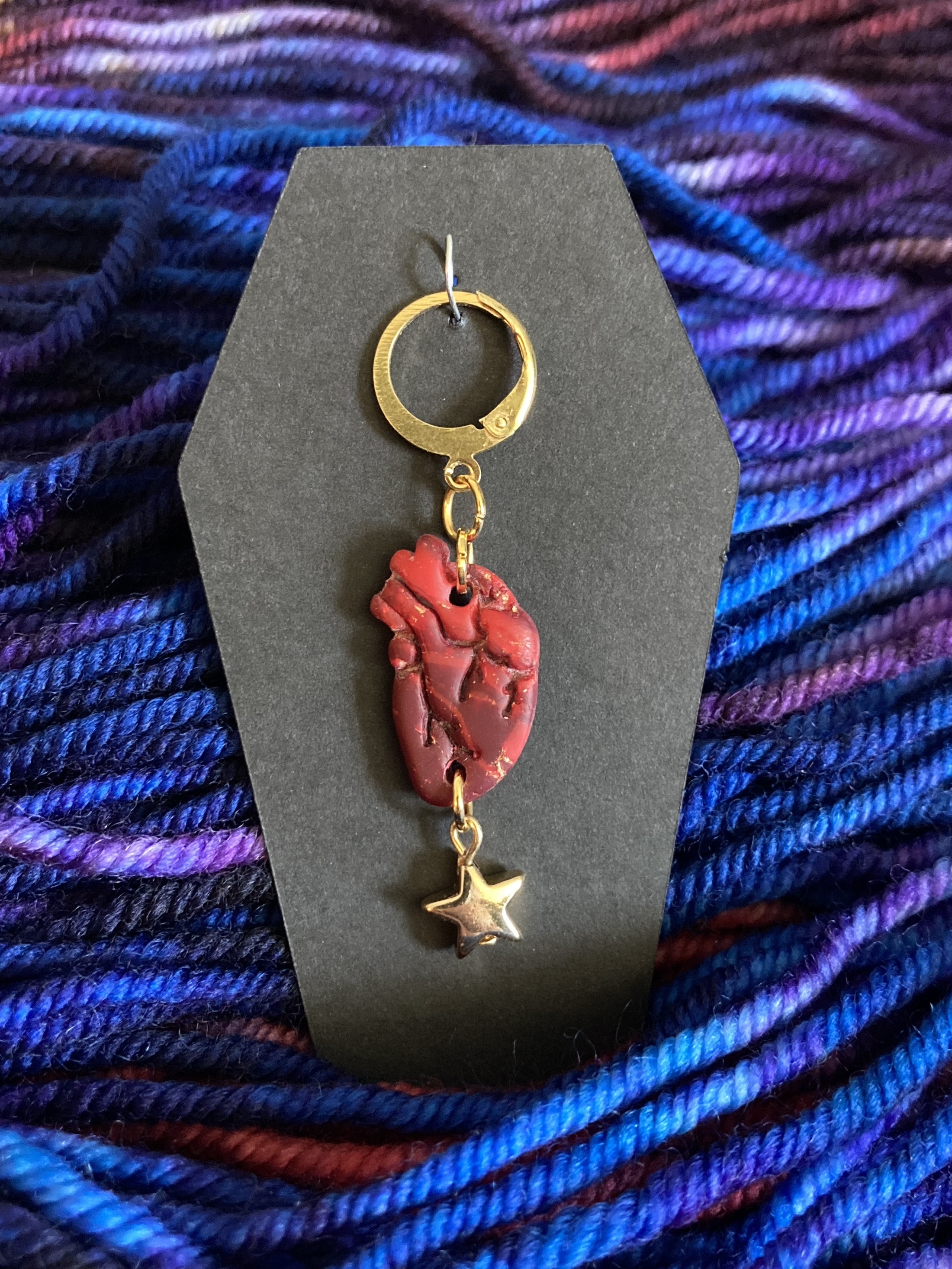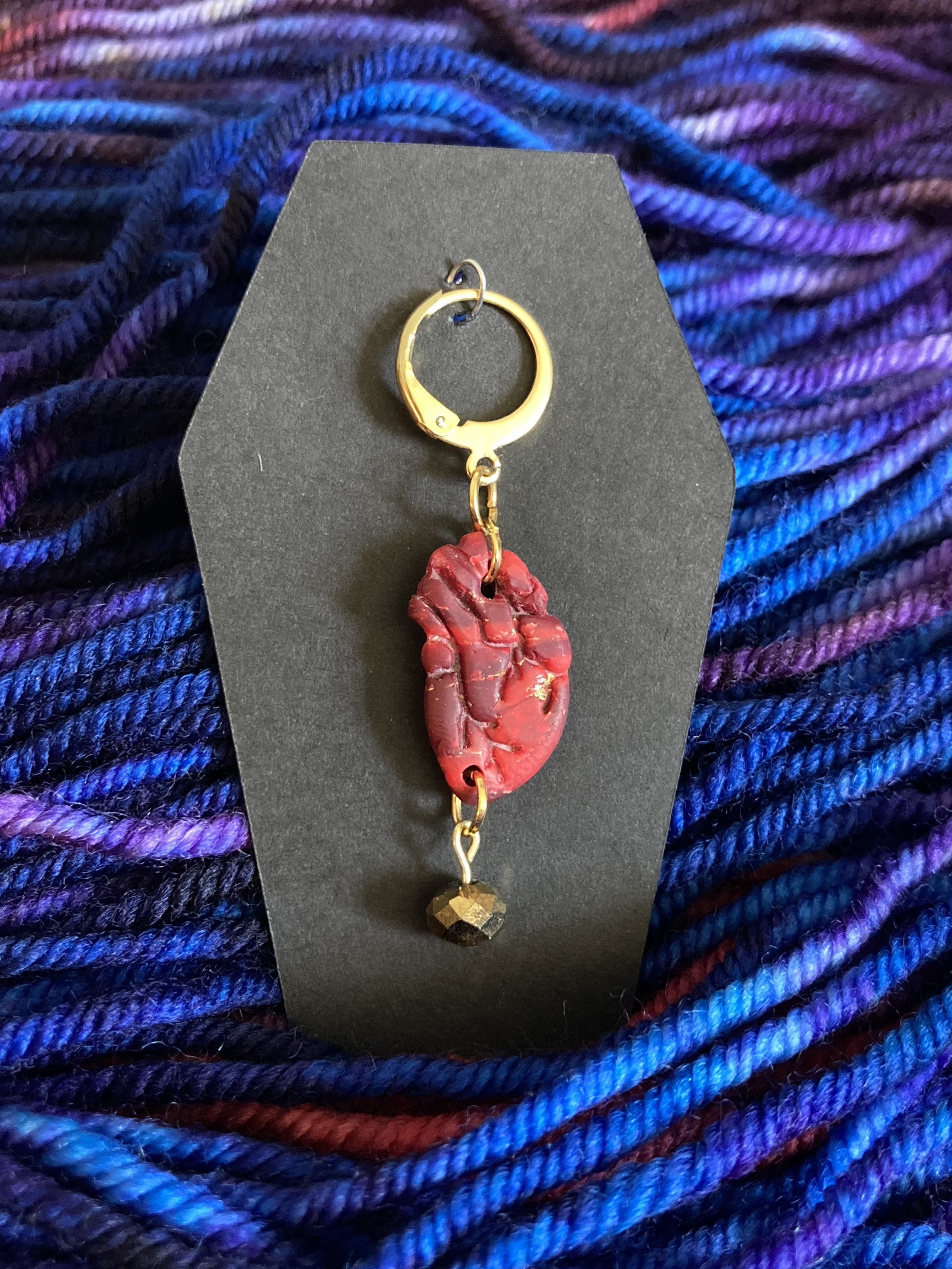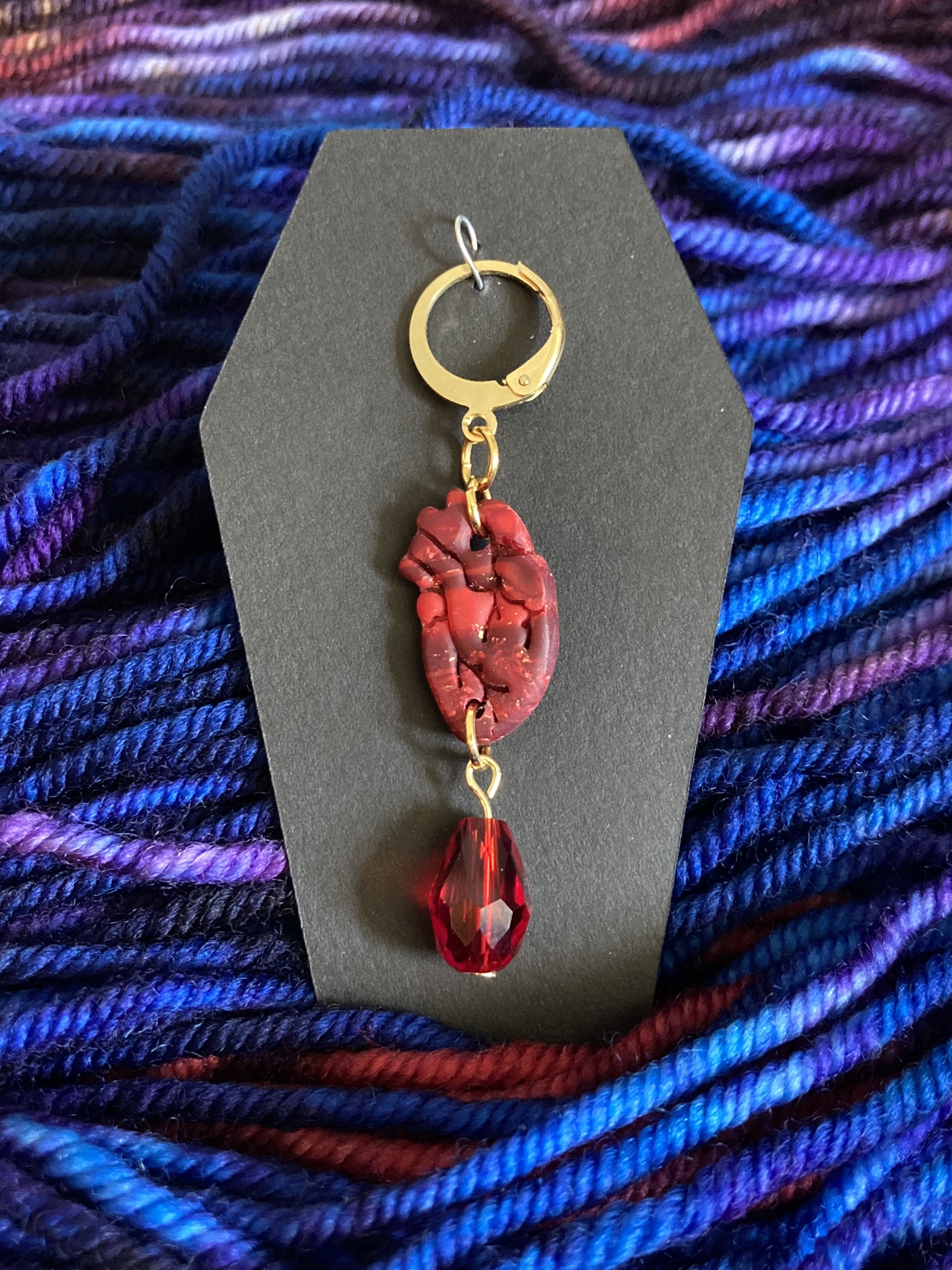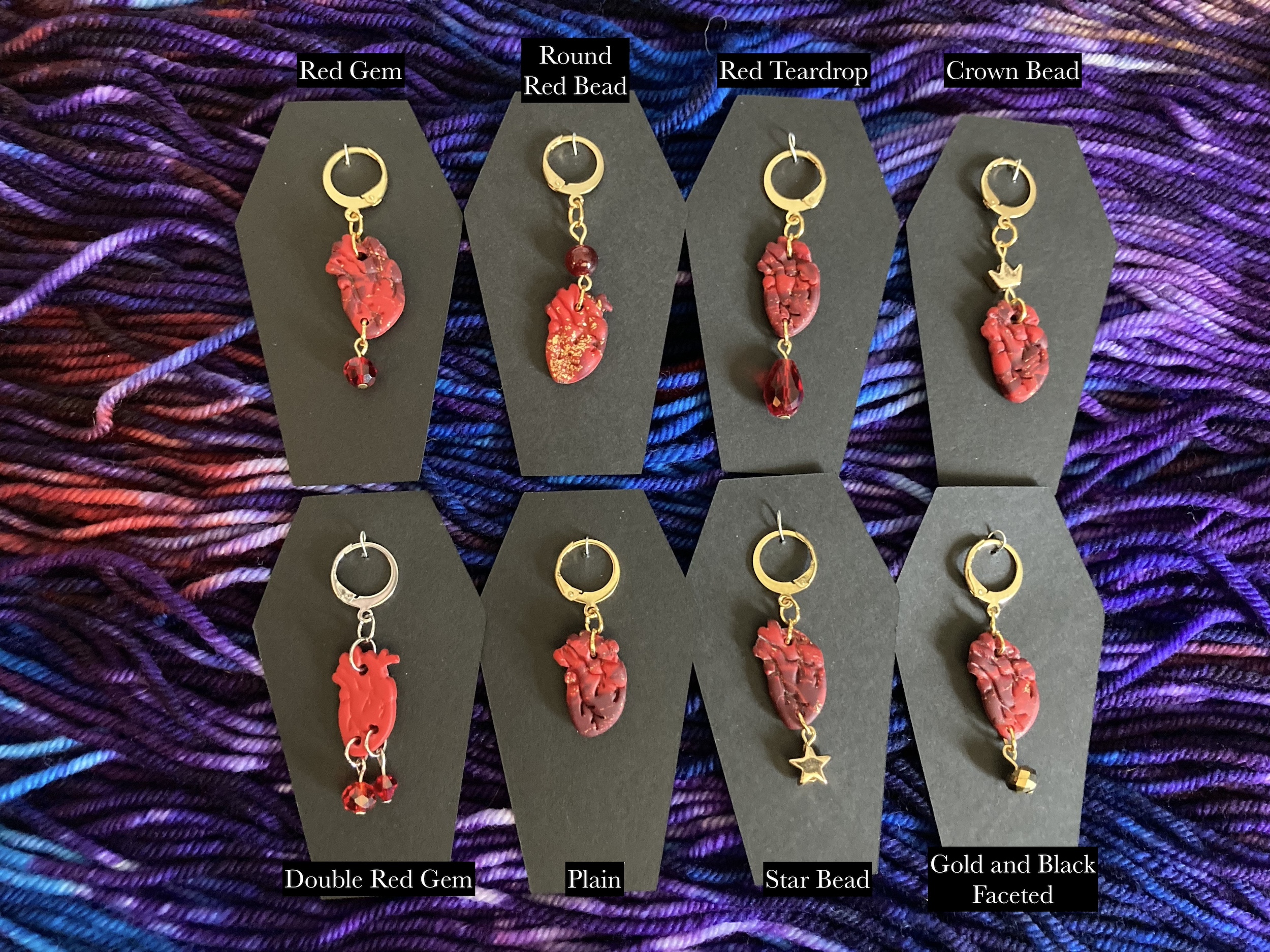 There are eight charms to choose from: plain, with a star bead, with a crown bead, with a red gem, with a faceted gold and black bead, with a round red bead, with a red teardrop, or with two red gems. The charms are about 1.5" - 2" long and hang from a lever back earring hook for ultimate versatility. The stitch markers are made from polymer clay and while flexible they are best for gentle use! Stitch markers are sold individually.