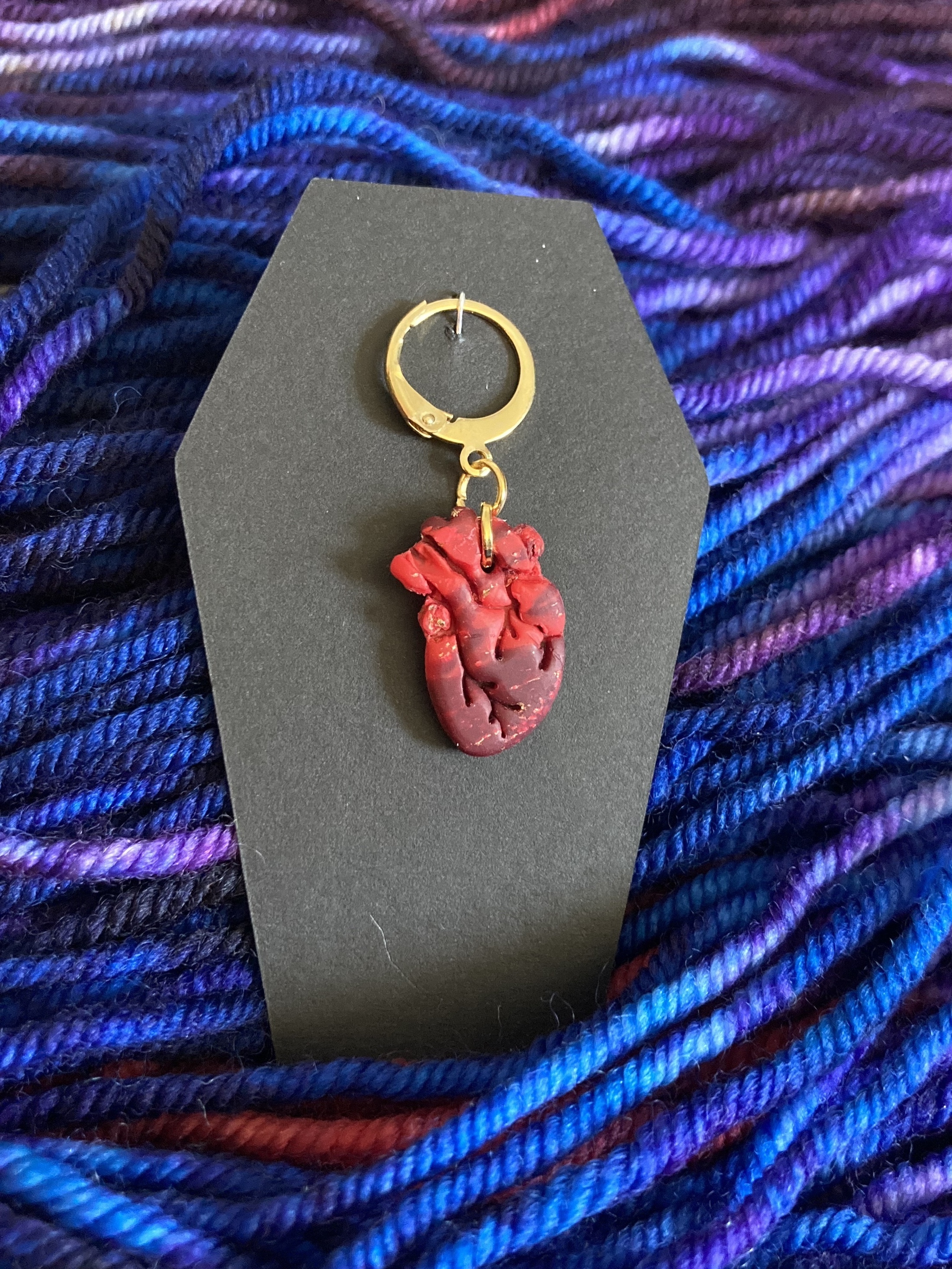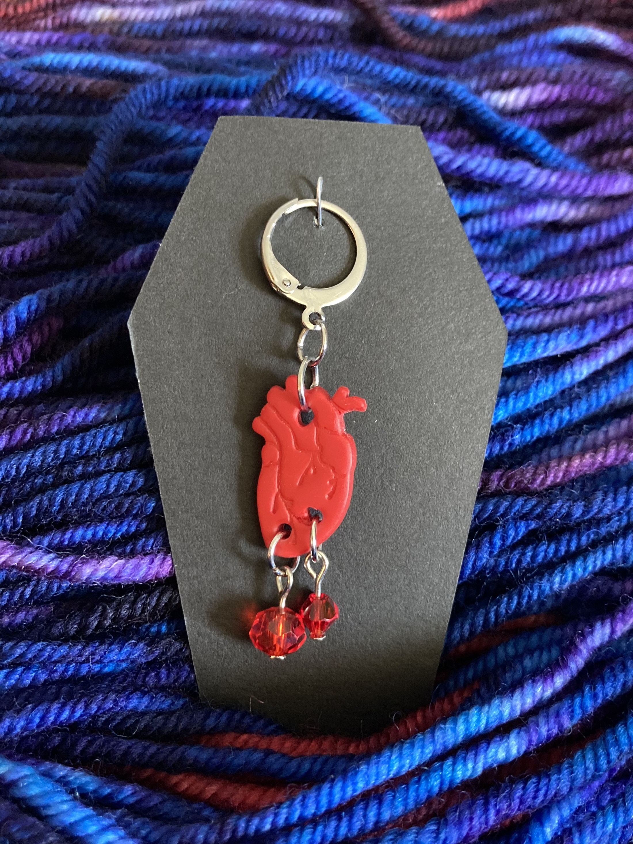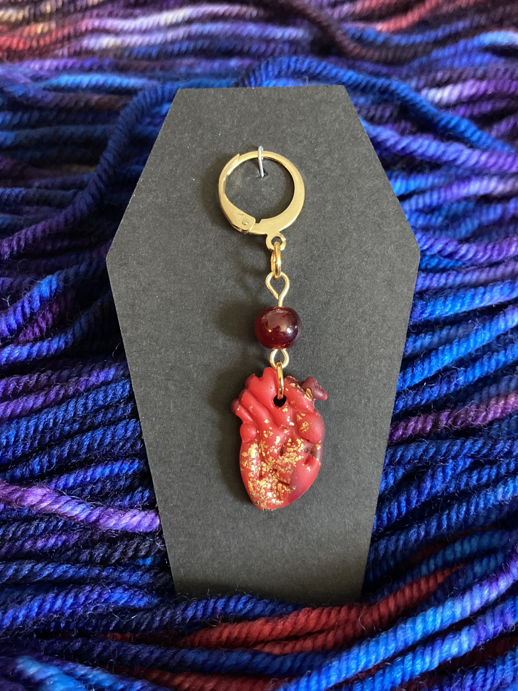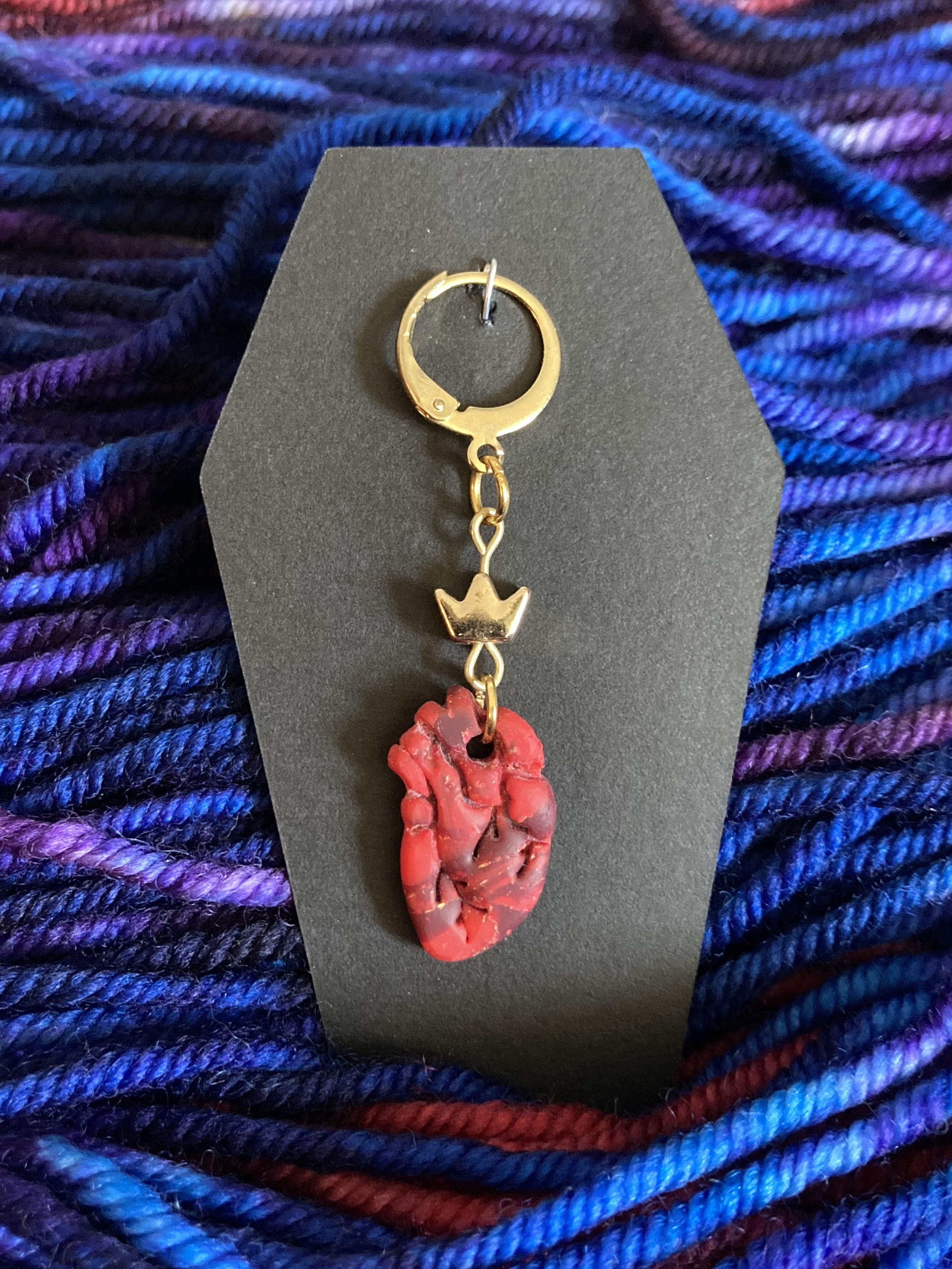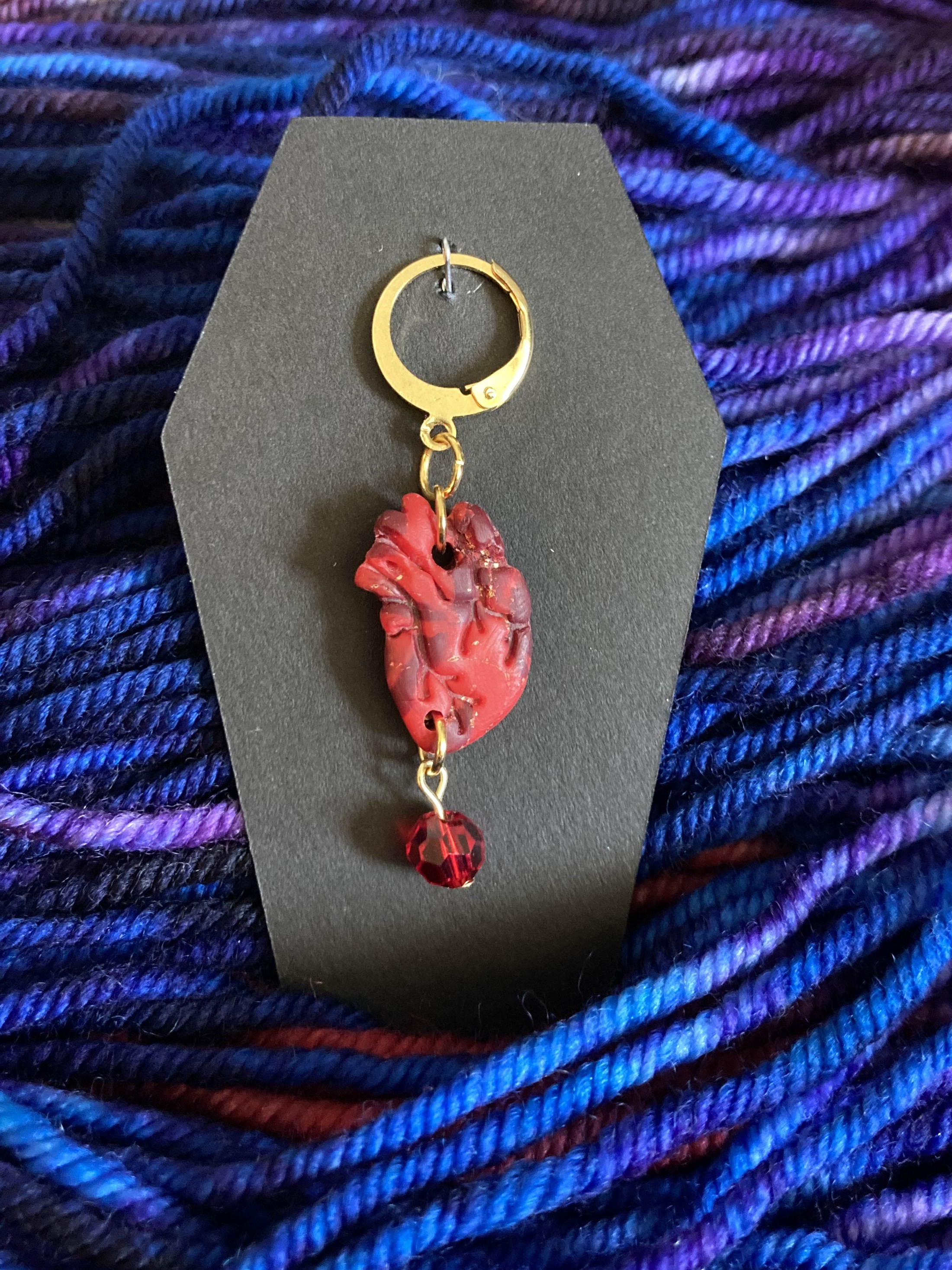 There are eight charms to choose from: plain, with a star bead, with a crown bead, with a red gem, with a faceted gold and black bead, with a round red bead, with a red teardrop, or with two red gems. The charms are about 1.5" - 2" long and hang from a lever back earring hook for ultimate versatility. The stitch markers are made from polymer clay and while flexible they are best for gentle use! Stitch markers are sold individually.