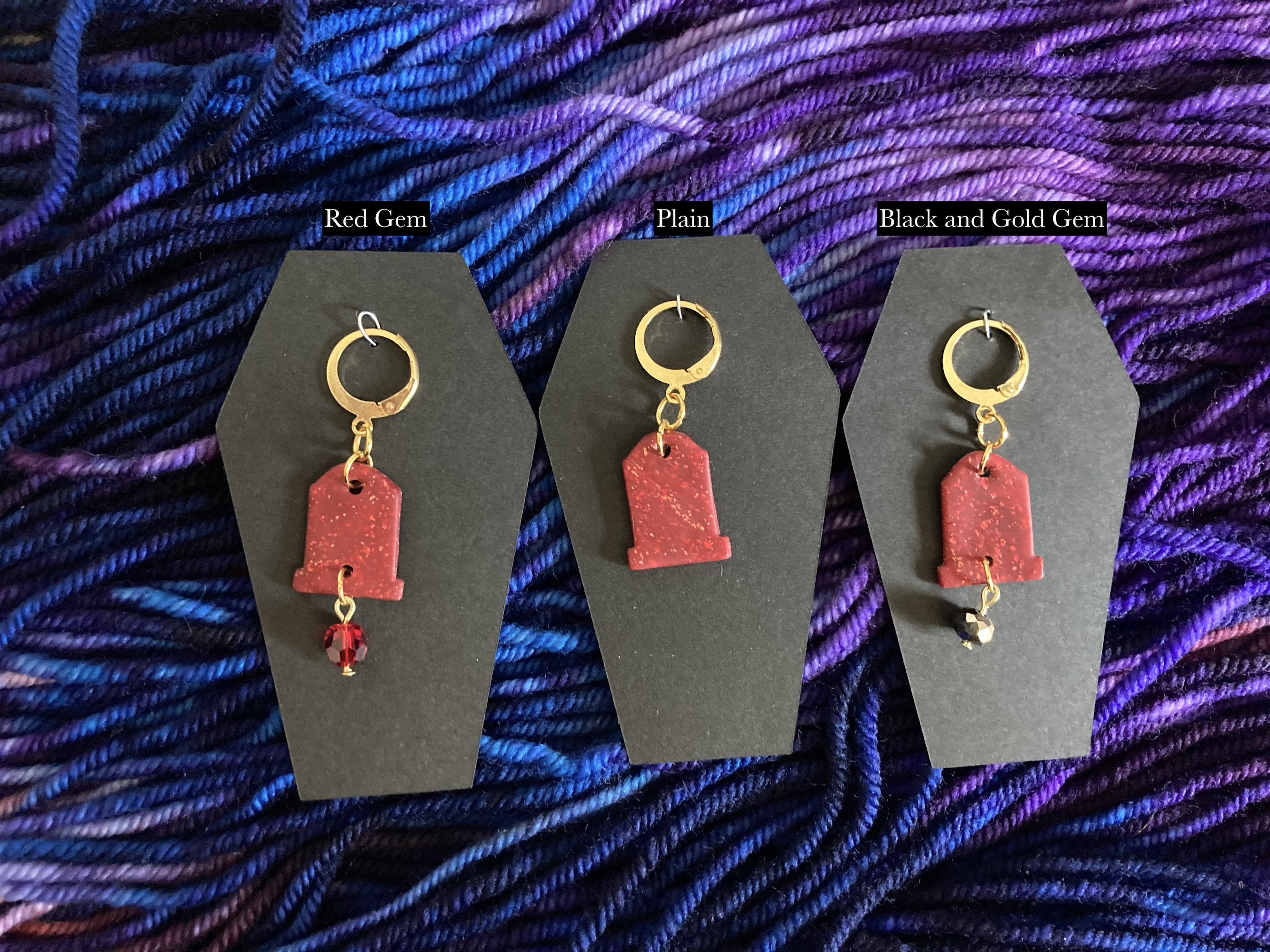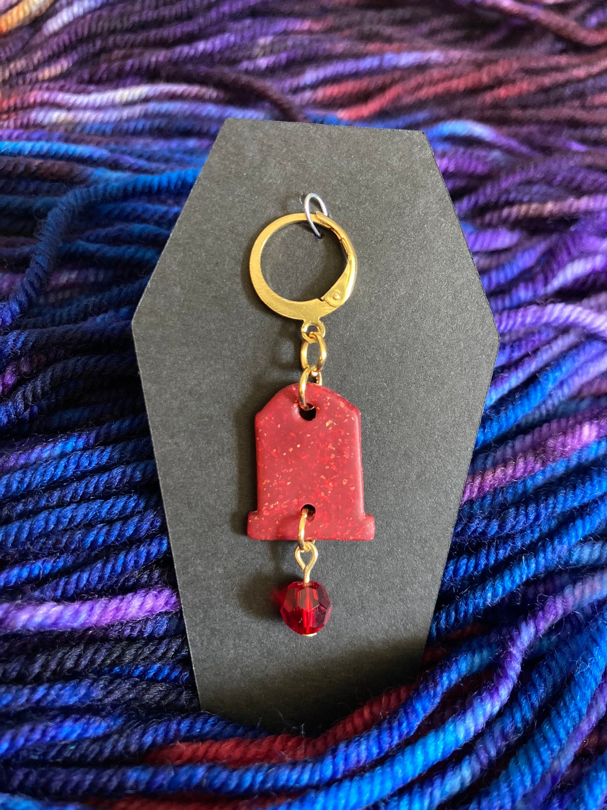 There are three charms to choose from: plain, with a faceted gold and black gem, or with a red gem. The charms are about 1.5" - 2" long and hang from a lever back earring hook for ultimate versatility. The stitch markers are made from polymer clay and while flexible they are best for gentle use! Stitch markers are sold individually.
