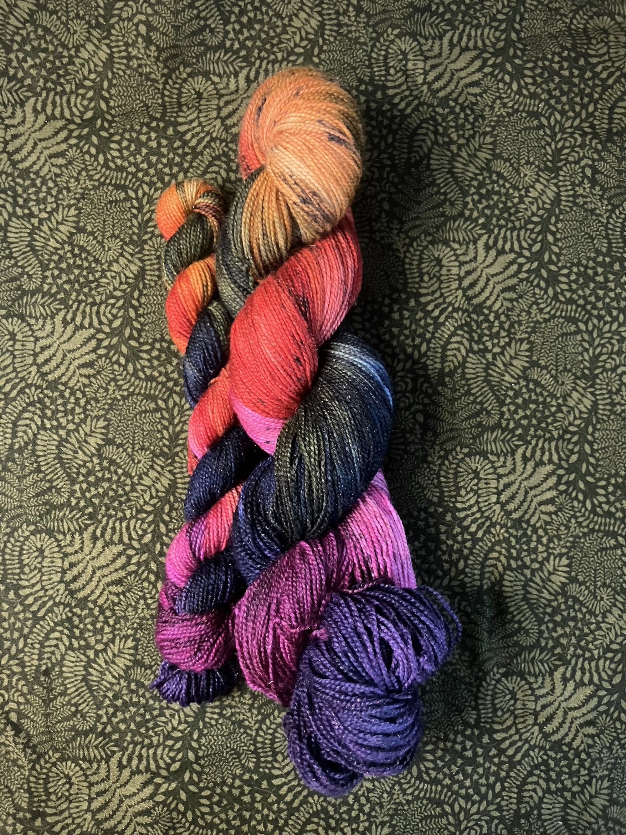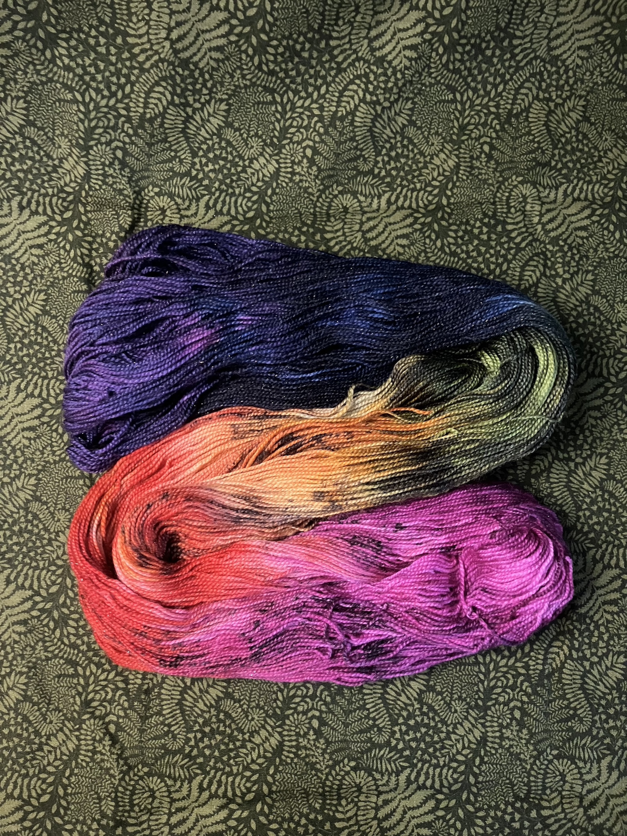 Due to the nature of hand dyeing, there are no dye lots and some variation between skeins is to be expected. If you need more yarn than is currently available, please feel free to reach out about a larger batch!