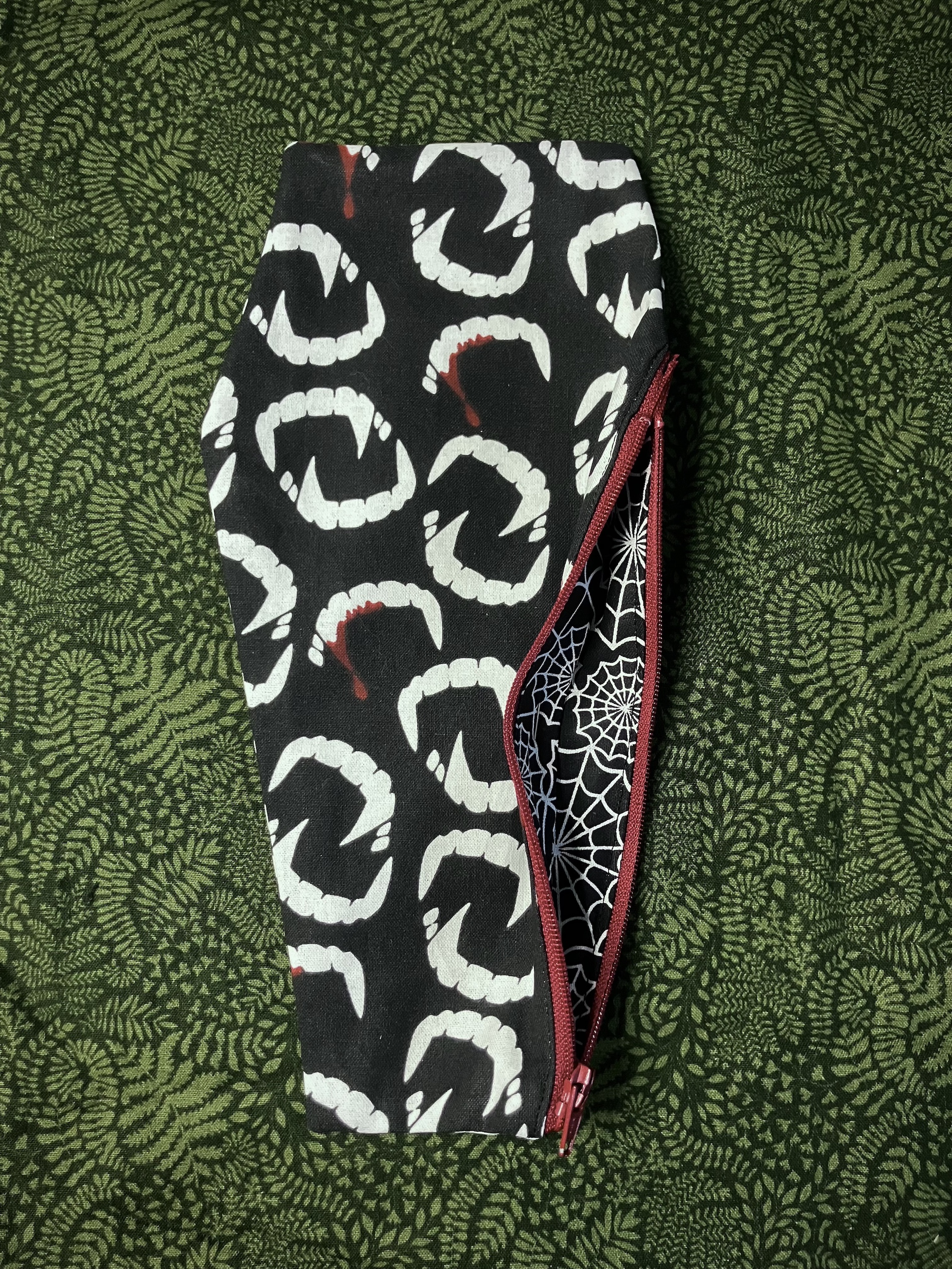 This coffin shaped bag is perfect for keeping your notions organized! It's long enough to fit most pairs of scissors, crochet hooks, knitting needles, stitch markers, and beyond.