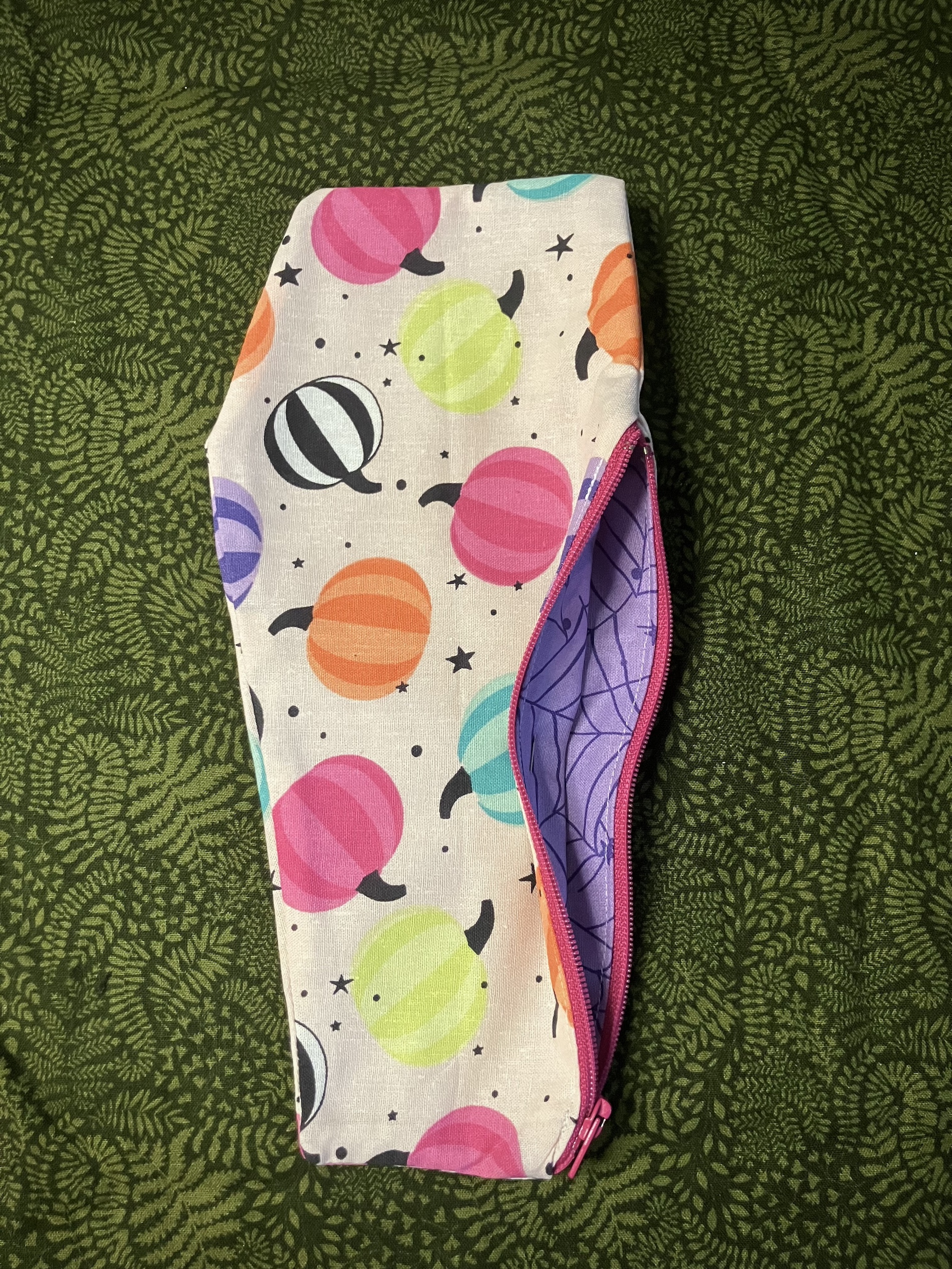 This coffin shaped bag is perfect for keeping your notions organized! It's long enough to fit most pairs of scissors, crochet hooks, knitting needles, stitch markers, and beyond.