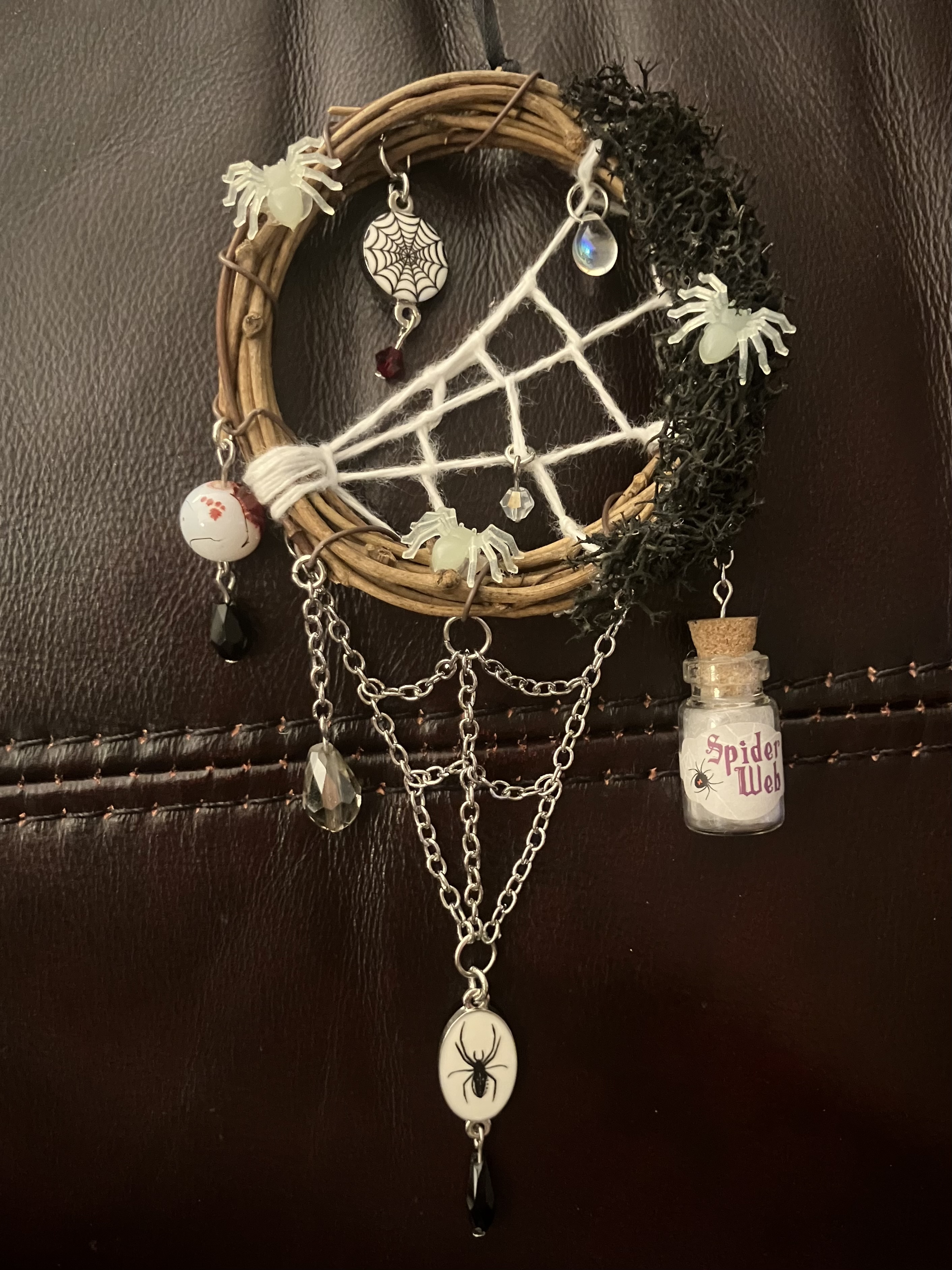 This grapevine wreath ornament is decorated with silver chains, a yarn web, and spidering charms for a spooky look. The web and spiders both glow in the dark!
