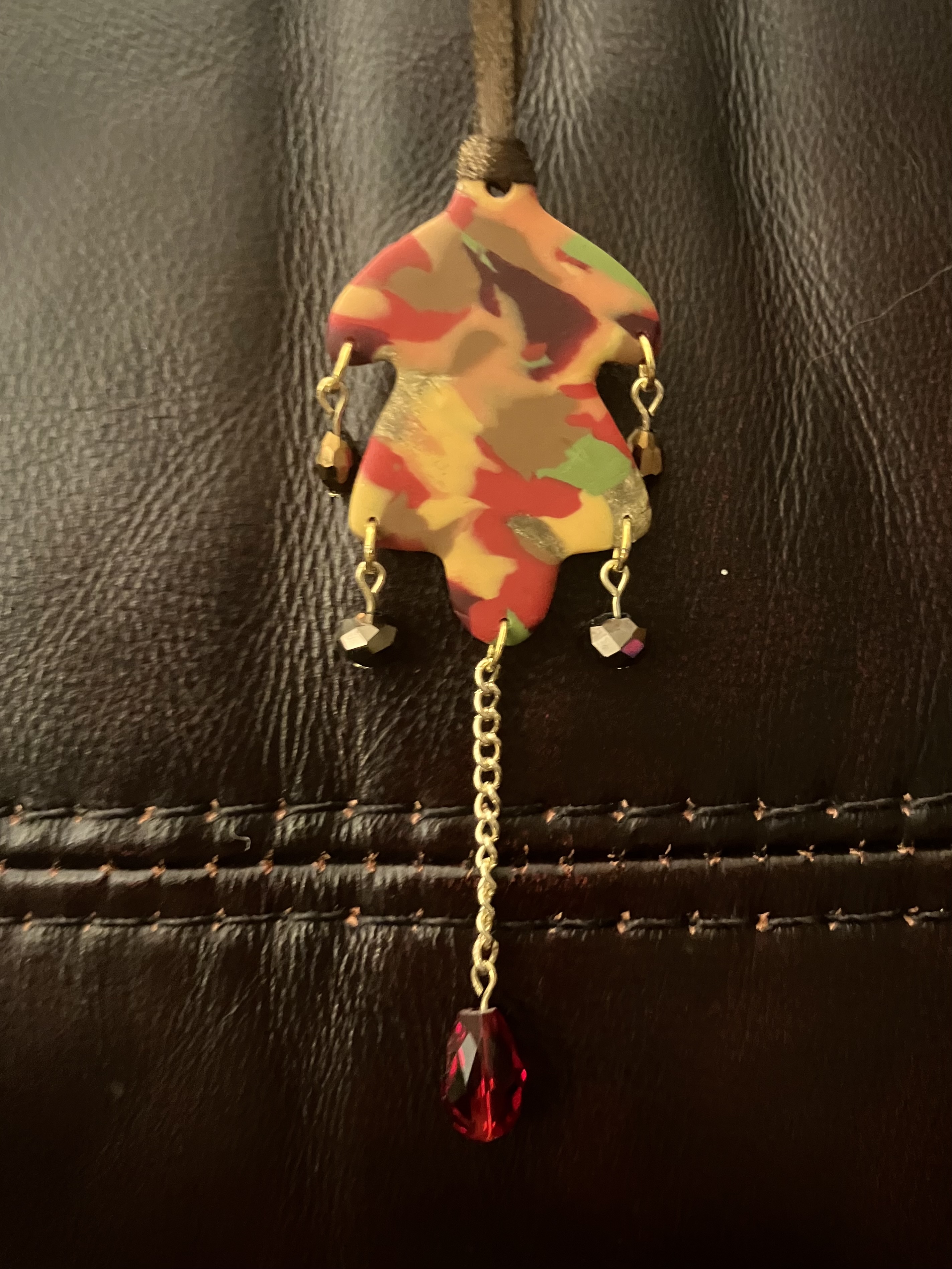 This ornament is decorated with gold chains and beads attached to a polymer clay acorn.